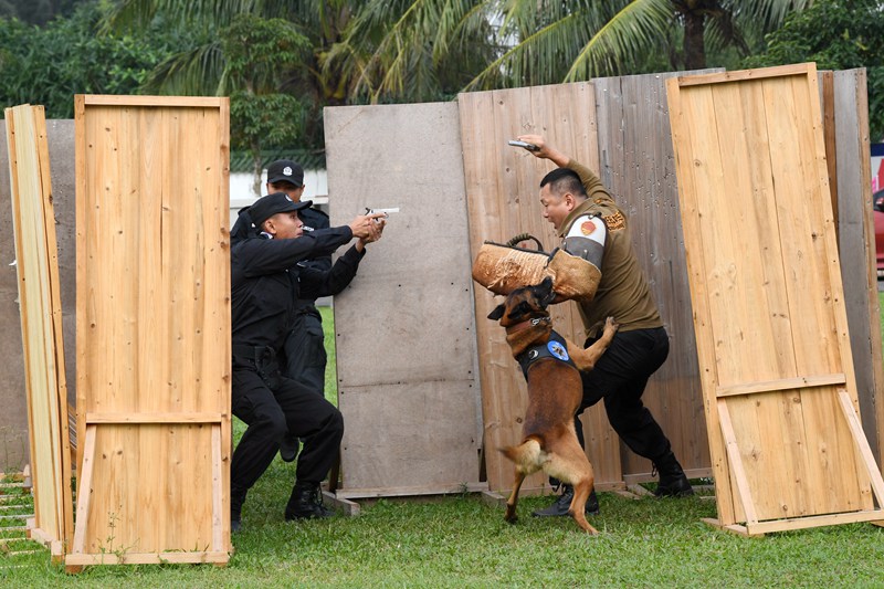 上午9點(diǎn),警犬技術(shù)匯報(bào)演練正式開始,進(jìn)行匯報(bào)演練的是從全省174名警犬技術(shù)人員和238頭警犬中選撥出來的優(yōu)秀代表,共有單犬服從、穿越障礙、箱包搜毒、飛車撲咬、車輛搜爆、追蹤、房屋搜捕、制服暴恐分子(雙犬撲咬)、群體性事件處置等九個(gè)項(xiàng)目,現(xiàn)場(chǎng)氣氛濃厚,競(jìng)爭(zhēng)激烈。此次警犬技術(shù)實(shí)戰(zhàn)對(duì)抗比武為期三天,來自全省公安機(jī)關(guān)的59名帶犬民警和45頭警犬將參加追蹤、搜捕、搜毒、搜爆等4個(gè)科目的比武,將決出團(tuán)體前三名和4個(gè)單項(xiàng)科目的前三名,參加比武的都是勤學(xué)苦練、甘于奉獻(xiàn)的基層警犬技術(shù)人員,他們積極使用警犬技術(shù)維護(hù)一方平安,為建設(shè)平安海南默默貢獻(xiàn)力量。 -