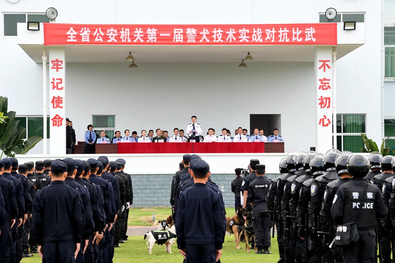 人民網(wǎng)訊 12月5日上午,海南省公安機(jī)關(guān)第一屆警犬技術(shù)實(shí)戰(zhàn)對(duì)抗比武開幕式在省公安廳刑警總隊(duì)警犬訓(xùn)練基地拉開帷幕。省公安廳黨委書記、廳長(zhǎng)范華平出席開幕式并講話。范華平強(qiáng)調(diào),全省公安機(jī)關(guān)警犬技術(shù)工作要以黨的十九大精神為統(tǒng)領(lǐng),緊緊圍繞新時(shí)代海南公安工作的新任務(wù)、新要求,牢固樹立“工匠精神”理念和“首戰(zhàn)用我、用我必勝”的信心和決心,不斷提升警犬技術(shù)訓(xùn)練水平和實(shí)戰(zhàn)能力,不斷拓寬警犬技術(shù)使用領(lǐng)域,在打擊、預(yù)防犯罪和維護(hù)社會(huì)治安穩(wěn)定工作中發(fā)揮更大作用,努力開創(chuàng)全省警犬技術(shù)工作新局面。 -