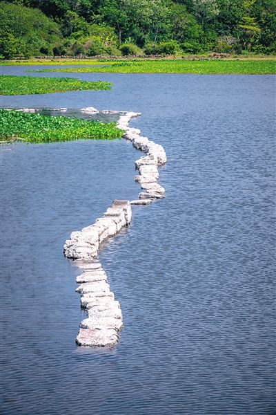 除了上述所說的塘陂水壩自流灌渠系統(tǒng)以外,羊山濕地還有著火山熔巖水塘-火山石溝渠-沼澤濕地多功能水資源與水環(huán)境調(diào)控體系,融水利、灌溉、通行、水生生物生境于一體的火山石蛇橋,類似都江堰渠首工程“魚嘴”分水結(jié)構(gòu)的五孔尖墩石橋,田洋系統(tǒng),熱帶林-火山涌泉-河溪濕地復(fù)合體等等,充分展示了羊山的生態(tài)智慧。