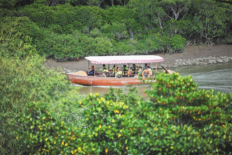 游客坐船游覽海口市東寨港紅樹林旅游區(qū)。海南日報(bào)記者 袁琛 攝