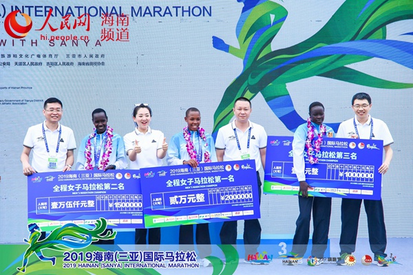 海南省旅游和文化廣電體育廳群體處處長麥有旺、三亞市旅游和文化廣電體育局局長陳震旻、匹克華南營銷中心總經(jīng)理占冠世、中央電視臺少兒頻道主持人月亮姐姐為全程馬拉松女子前三名頒獎