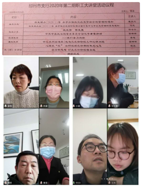 為貫徹落實上級行關于加強新型冠狀病毒感染的肺炎疫情防控工作系列要求,充分發(fā)揮黨支部在疫情防控中的基礎保障作用,調適疫情下返崗復工員工心理,2月28日,農(nóng)發(fā)行邳州支行利用云視頻會議系統(tǒng)開展“心理防疫”黨日活動,進一步扎緊員工心理防疫“口罩。