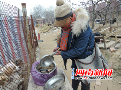 在愛(ài)心人士看狗的間隙,初會(huì)忙著將從家里熬好帶過(guò)來(lái)的一鍋骨頭面條分給幾只剛生產(chǎn)完的母狗,熬狗糧的鍋就是她給自己做飯的鍋。盡管雙手殘缺,但是干起活來(lái)她絲毫不輸常人!肮穻寢屝枰裢庹疹,和人一樣,需要‘坐月子’嘛。”初會(huì)樂(lè)呵呵地說(shuō)。