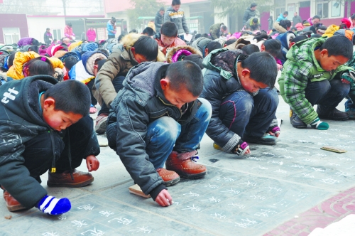 每天早上,全校學(xué)生上課前都要蹲在地上練寫20個粉筆字。