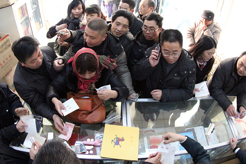 1月5日,集郵愛好者在江蘇省連云港市贛榆縣郵政局購買《甲午年》生肖“馬”郵票。(司偉 攝)