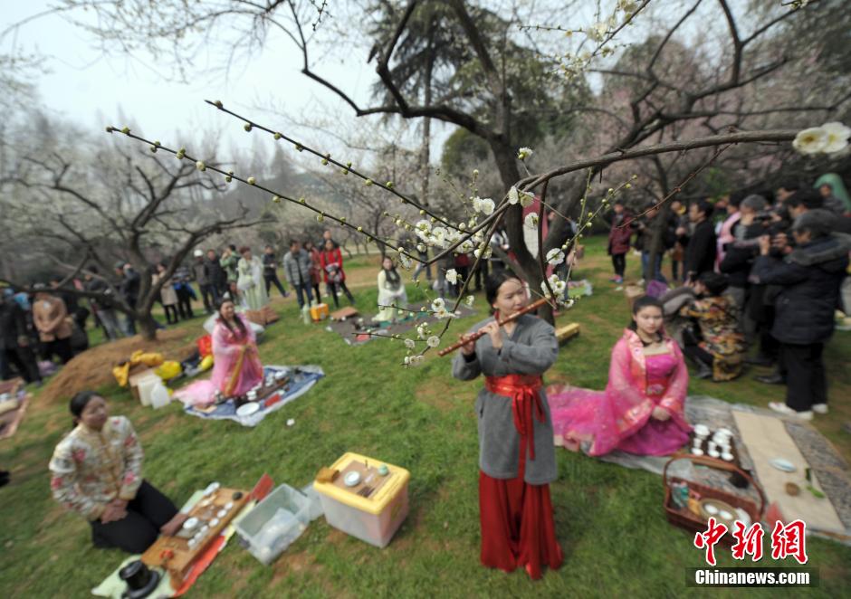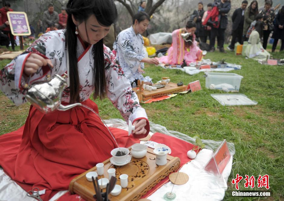 央廣網(wǎng)河南分網(wǎng)消息 據(jù)中新網(wǎng)報(bào)道:2月23日,湖北武漢東湖梅園內(nèi),身著古裝的美女茶藝師展示茶道藝術(shù),花、香、茶、書、樂(lè)的“五雅之境”,吸引了眾多市民游客圍觀。(中新社發(fā) 張暢 攝)