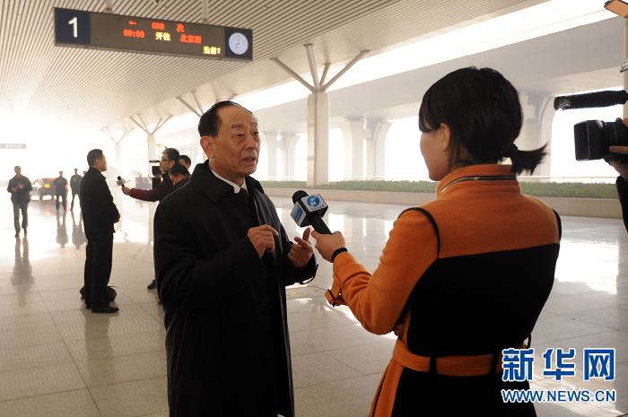3月2日,全國(guó)人大代表唐祖宣(左)乘車(chē)前在鄭州東火車(chē)站接受記者采訪。