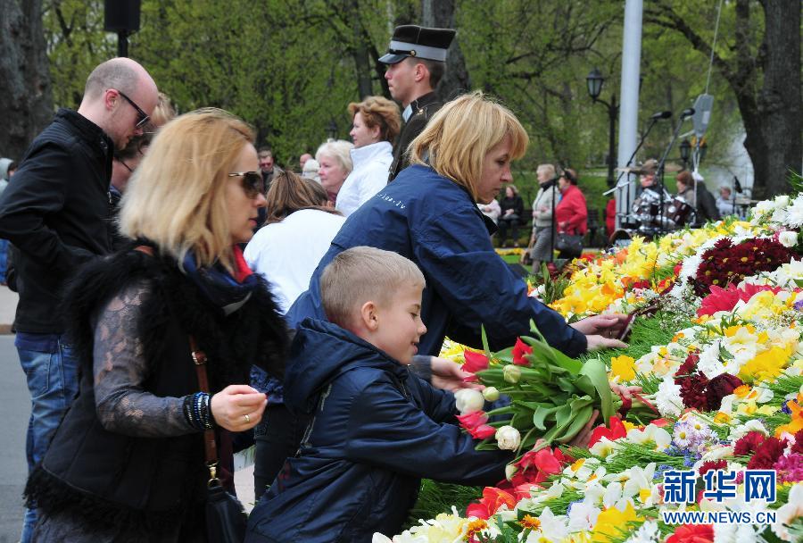 5月4日,在拉脫維亞首都里加,兒童在家長的帶領(lǐng)下向獨立紀念碑獻花。