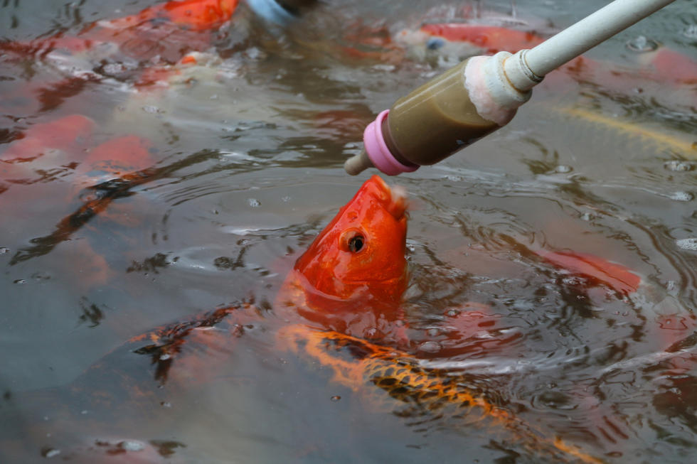 央廣網(wǎng)河南分網(wǎng)消息 2015年08月20日,安徽省合肥市,逍遙津公園湖面長廊上的用奶瓶給金魚喂食的娛樂項(xiàng)目,吸引眾多游客參與。奶瓶喂魚是將魚食制成液體裝入奶瓶內(nèi)喂食金魚,新奇有趣的喂食方法吸引眾多家長帶著孩子的親子游客參與。駐足觀看的游客感嘆“城會(huì)玩”。圖為一只金魚頭躍出水面“喝奶”。