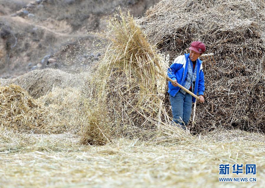 11月3日,和林格爾縣黑老夭鄉(xiāng)昆都侖村一名村民在打場(chǎng)碾壓莜麥。
