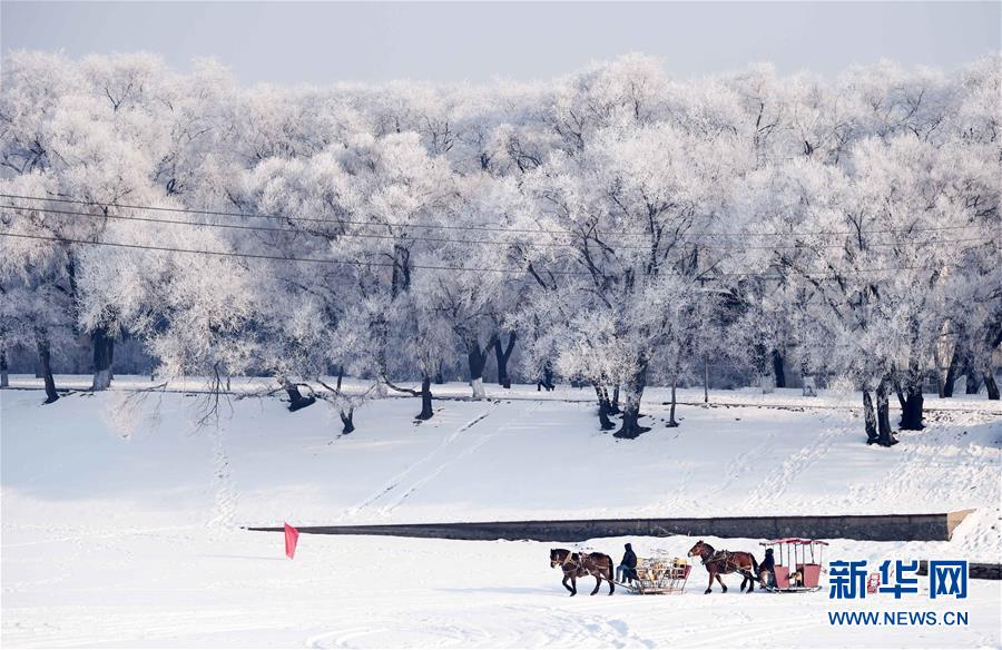 12月25日,在太陽島風景區(qū),兩輛馬拉雪橇從一處霧凇景觀經(jīng)過。當日,享譽國內(nèi)外的冰城哈爾濱市5A級景區(qū)太陽島風景區(qū)迎來霧凇景觀。太陽島上的草木被霧凇裝點,晶瑩剔透、美不勝收。 新華社記者 王建威攝
