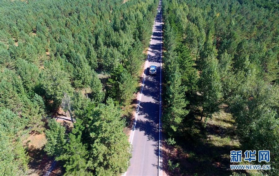車輛行駛在內(nèi)蒙古伊金霍洛旗境內(nèi)的樟子松基地(9月7日攝)。 -