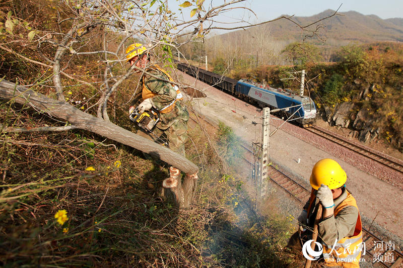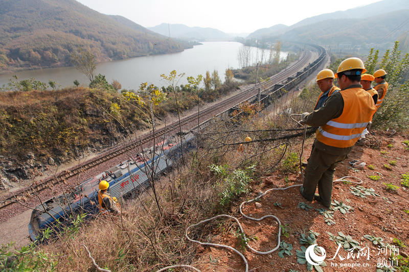 11月17日,河南省南陽工務(wù)段平頂山西橋梁車間職工,一路披荊斬棘,沿著陡峭山坡爬到山頂,對臨近鐵路線兩側(cè)的山體進(jìn)行雜樹砍伐、危石清除和安裝主動防護(hù)網(wǎng)作業(yè)。 -
