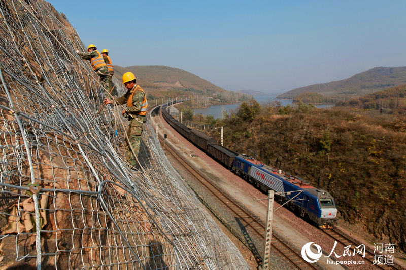 峭壁上“行走”。鐵路兩側(cè)受地形地貌、巖石屬性等復(fù)雜條件的限制和制約,每逢雨雪天氣,時有石塊從山上掉落,山體滑坡、塌方等危險情況隨時可能發(fā)生,嚴(yán)重威脅線路設(shè)備和行車的安全。為排除隱患,該段成立山體加固施工隊,根據(jù)之前調(diào)查的整治任務(wù),按照整治方案對山體進(jìn)行加固防護(hù)。(霍亞平) -