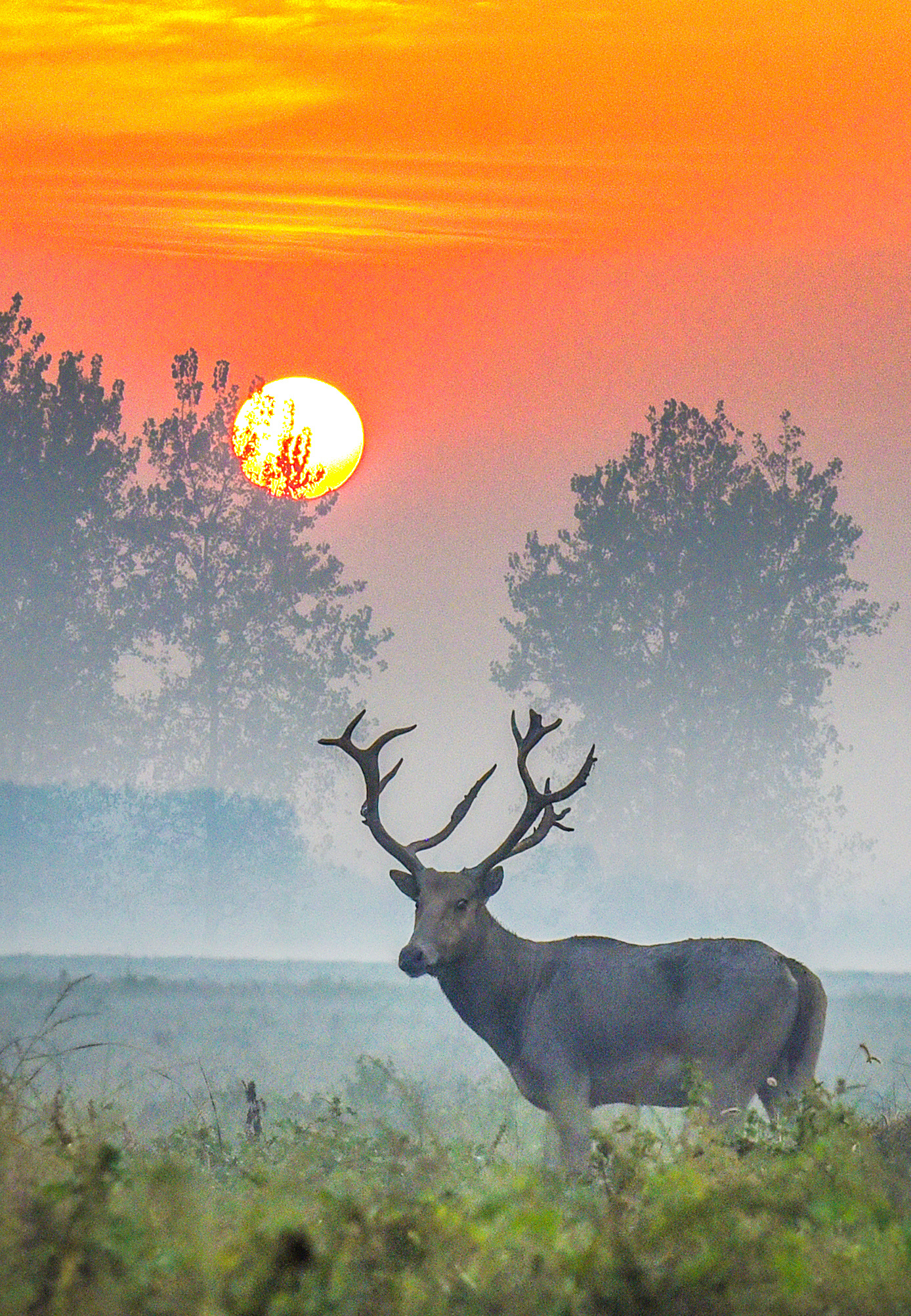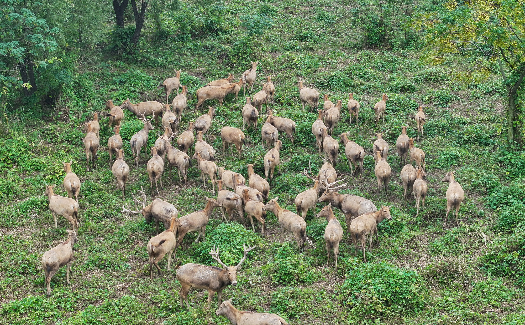 與江豚隔水相望,石首麋鹿保護(hù)區(qū)內(nèi),4500余頭麋鹿在廣袤濕地中自由棲息。