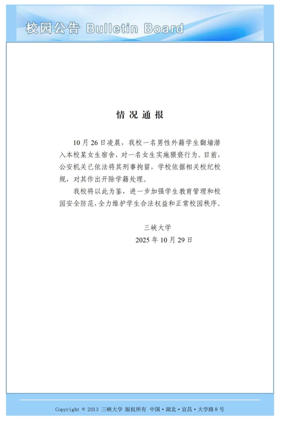 央廣網(wǎng)宜昌10月29日消息(記者鄧子依)10月29日,三峽大學發(fā)布情況通報,10月26日凌晨,該校一名男性外籍學生翻墻潛入該校某女生宿舍,對一名女生實施猥褻行為。目前,公安機關(guān)已依法將其刑事拘留,學校依據(jù)相關(guān)校紀校規(guī),對其作出開除學籍處理。