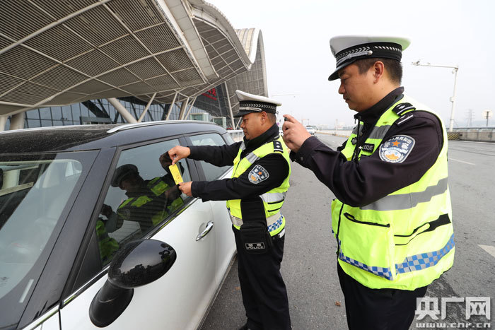 11月16日,武漢火車站,武漢市交通管理局鐵路大隊民警對在火車站車行平臺上違法停放的機動車依法予以處罰。