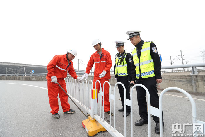 11月16日,武漢火車站車行平臺匝道,武漢市交通管理局鐵路大隊民警督導(dǎo)加裝隔離護欄。