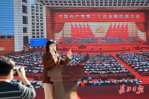 音樂展示《國際歌》《春天的故事》《理想》、聽歌識曲《東方紅》《游擊隊歌》《紅梅贊》、湖北大鼓《二十大精神指航向》、全場合唱《沒有共產黨就沒有新中國》……課程圍繞黨的二十大主題、大會報告的主要內容和核心要義進行了系統(tǒng)闡述,同時音樂與黨課互相交融,現(xiàn)場觀眾在紅色經(jīng)典曲目中感受一幕幕或悲壯激烈,或輝煌壯麗的黨史畫卷。