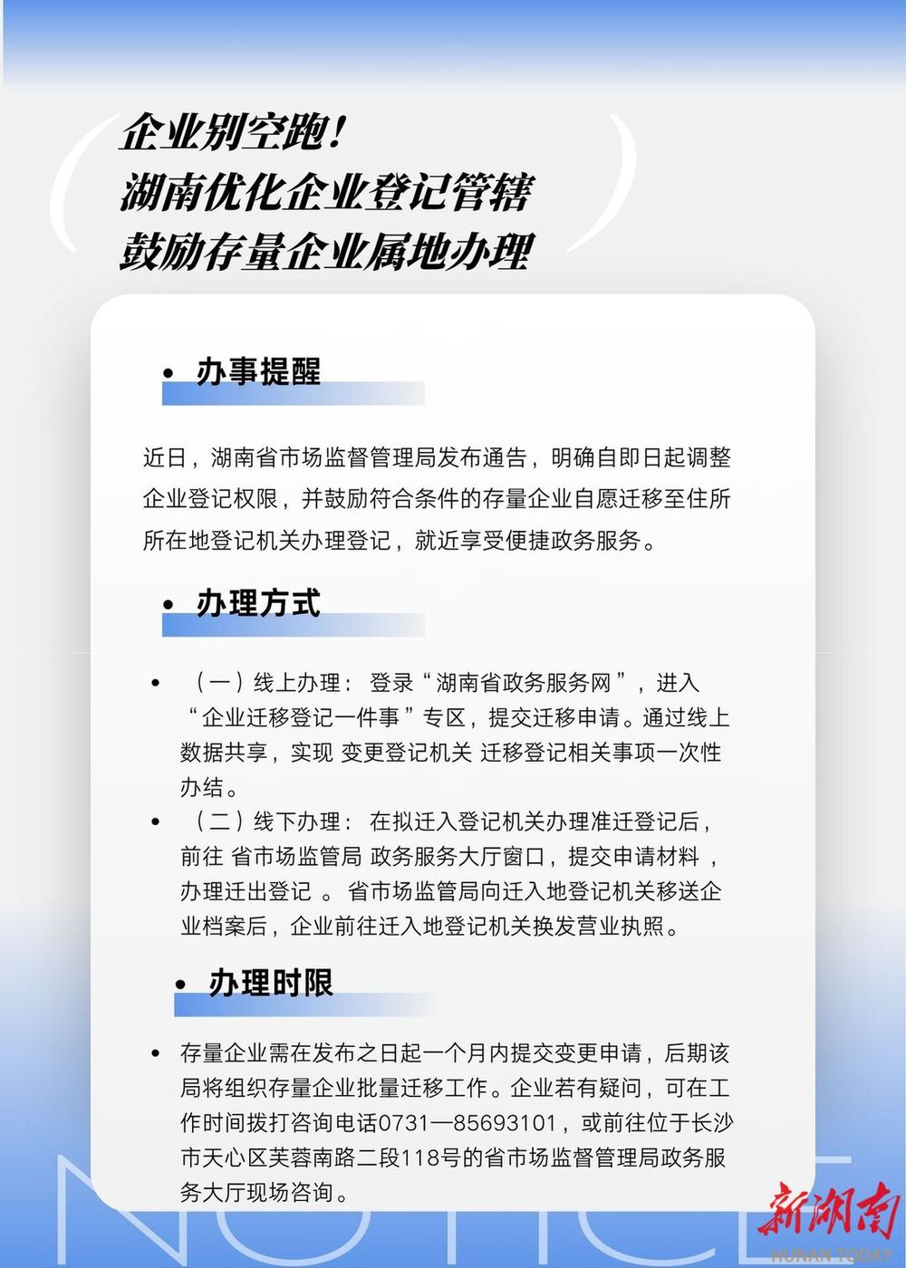 通告明確,存量企業(yè)需在發(fā)布之日起一個月內(nèi)提交變更申請,后期該局將組織存量企業(yè)批量遷移工作。企業(yè)若有疑問,可在工作時間撥打咨詢電話0731—85693101,或前往位于長沙市天心區(qū)芙蓉南路二段118號的省市場監(jiān)督管理局政務(wù)服務(wù)大廳現(xiàn)場咨詢。