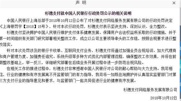 當日,杉德支付官網(wǎng)發(fā)布聲明稱,針對本次行政處罰,杉德支付表示堅決支持、深刻認識、全力整改。