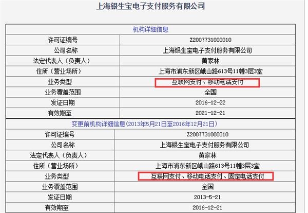 公開信息顯示,上海銀生寶電子支付服務有限公司成立于2006年5月30日。在2016年12月20日,上海銀生寶電子支付服務有限公司成功續(xù)展《支付業(yè)務許可證》,支付業(yè)務類型包括互聯(lián)網(wǎng)支付和移動電話支付業(yè)務,業(yè)務范圍全國。但其在2016年12月22日通過續(xù)展時,主動終止了固定電話支付業(yè)務。