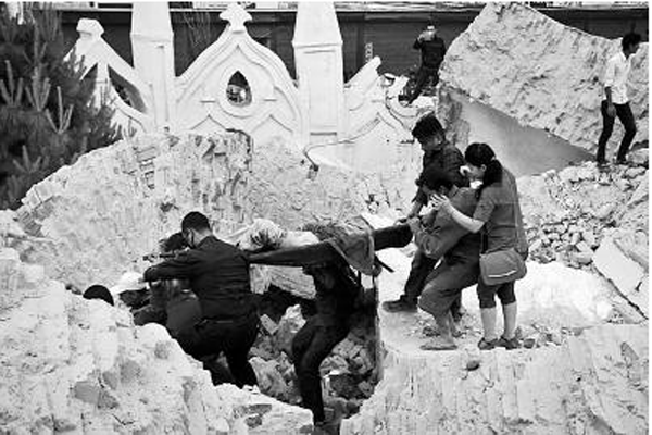 圖為人們從一處廢墟中抬出一具遇難者遺體。