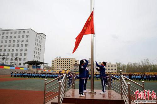 4月4日,北京市朝陽區(qū)實驗小學(xué)雄安校區(qū),全校師生在操場上舉行升旗儀式。