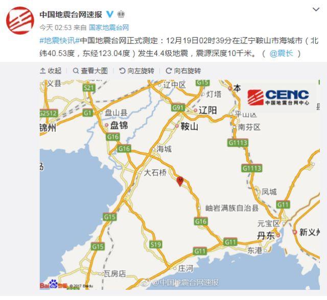 中國地震臺網(wǎng)正式測定:12月19日02時39分在遼寧鞍山市海城市(北緯40.53度,東經(jīng)123.04度)發(fā)生4.4級地震,震源深度10千米。