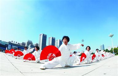 沈陽市跆拳道協(xié)會會員表演太極扇 展演隊伍中人數(shù)最多的,還是群眾體育團隊。作為群眾體育一項重要的健身成果,廣場舞已經(jīng)從中國走向世界,活動現(xiàn)場,在優(yōu)美的舞曲聲中,廣場舞團隊翩翩起舞;健步走是近年來群眾喜聞樂見的運動方式,在活動現(xiàn)場,健步走團隊就為人們展示了遼沈群眾的風采;秧歌是東北地區(qū)的特色,如今秧歌也與群眾體育融為一體,活動現(xiàn)場,在威風鑼鼓的伴奏下,健身秧歌隊伍載歌載舞,表現(xiàn)出了極佳的精神風貌; 手拍鼓或許并不難學,但數(shù)百人一起表演卻不容易,活動現(xiàn)場,手拍鼓團隊動作整齊劃一,讓人嘆為觀止。太極扇是展演的高潮部分,背景音樂是鏗鏘有力的《中國功夫》,讓所有人的心仿佛都跟著一起跳動。 -