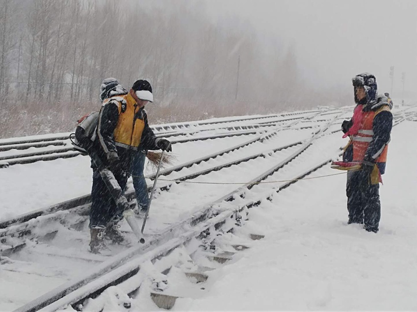 站車、工務(wù)部門成立100多個除雪小分隊,分赴沿線重點部位、關(guān)鍵處所,做到風(fēng)雪不停除雪不止。同時,組織休班人員值守火車道口,和當(dāng)班道口員一起對道口鋪面鏟冰除雪,確保了過往車輛和行人的安全。電務(wù)、供電部門安排專人“死看死守”哈大、長圖、沈吉等降雪較大的線路區(qū)段,密切關(guān)注信號設(shè)備運行狀況,及時發(fā)現(xiàn)和處理因降雪冰凍造成的信號通信設(shè)備故障,確保了設(shè)備正常運轉(zhuǎn)。 -