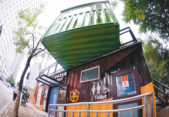 7月8日,在沈陽和平區(qū)咖啡(酒吧)街,一處二層文化主題集裝箱公廁亮相。一層為公共衛(wèi)生間,二層為公共休息區(qū)域,設(shè)手機充電器等便民設(shè)施。(記者 張文魁攝)