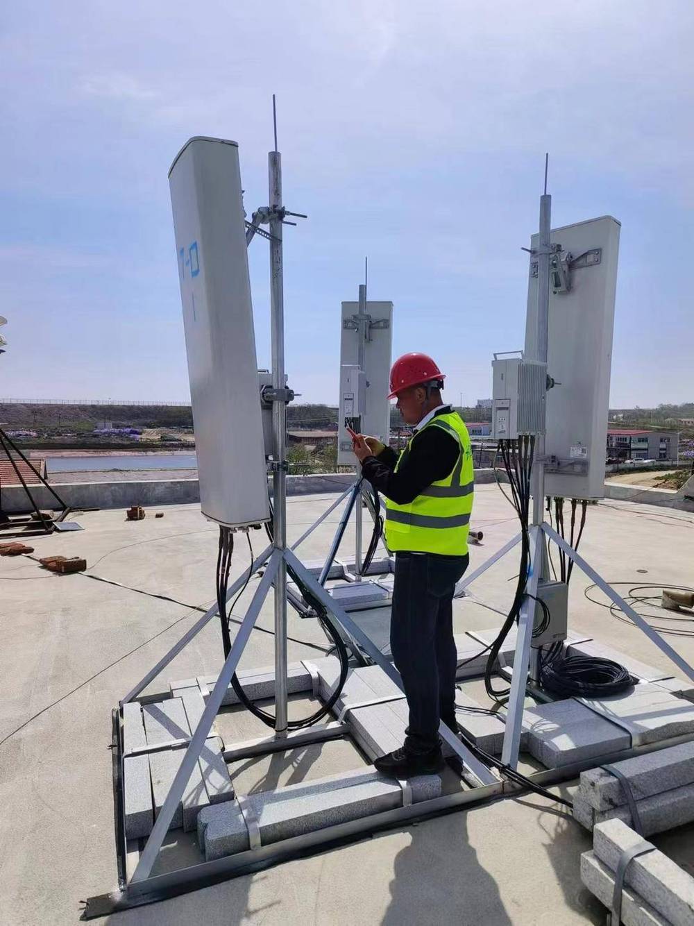 工作人員在建筑頂層開通并調(diào)試通信基站