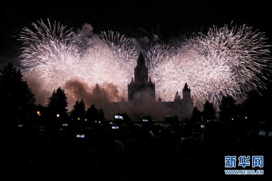 9月24日,在俄羅斯首都莫斯科,觀眾用手機(jī)拍攝在莫斯科大學(xué)主樓旁進(jìn)行的焰火表演。當(dāng)日,莫斯科舉辦國際燈光節(jié),莫斯科大學(xué)、全俄展覽中心、俄羅斯國家大劇院等建筑被燈光打上炫彩的圖案,為觀眾呈現(xiàn)精彩的燈光表演。新華社記者白雪騏攝
