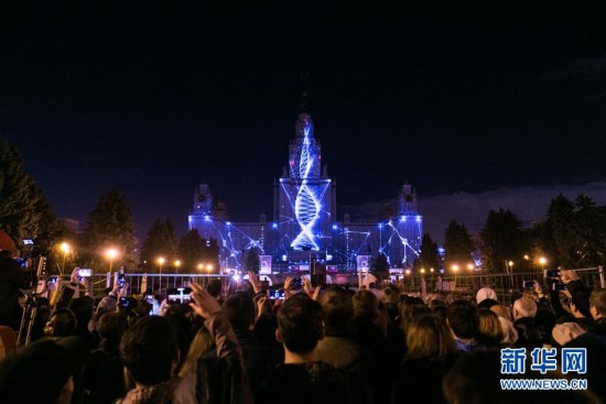 9月24日,在俄羅斯首都莫斯科,人們觀看映射在莫斯科大學(xué)主樓上的燈光秀。當(dāng)日,莫斯科舉辦國際燈光節(jié),莫斯科大學(xué)、全俄展覽中心、俄羅斯國家大劇院等建筑被燈光打上炫彩的圖案,為觀眾呈現(xiàn)精彩的燈光表演。新華社記者白雪騏攝