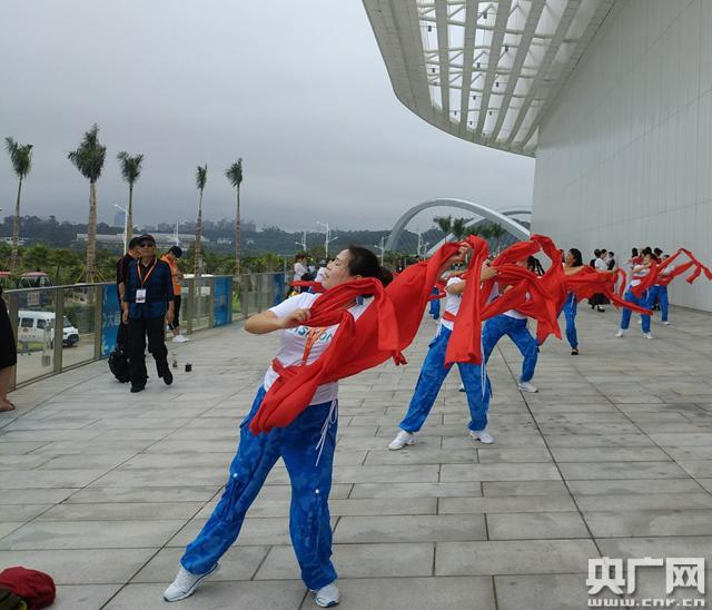 老年大學(xué)的阿姨們正在劇院外排練。 (央廣網(wǎng)記者 王笑蕾 攝)