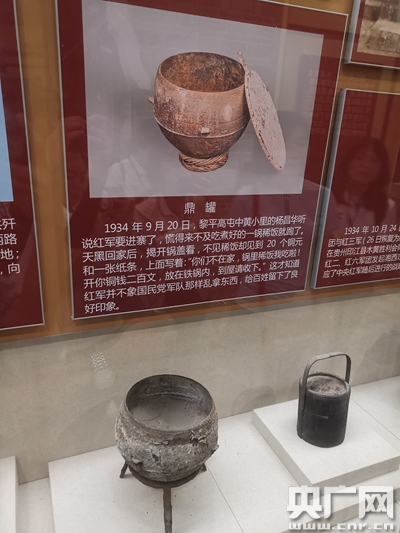 采訪的第一站,我們來到了位于黎平縣翹街的黎平會議紀(jì)念館。館長張中俞給記者們講述了展品鼎罐背后的故事。1934年9月20日,紅六軍團(tuán)來到黎平高屯中黃小里,村民楊昌華聽說紅軍進(jìn)寨了,受到欺騙宣傳的他認(rèn)為“紅軍是土匪”,來不及吃煮好的一鍋稀飯就跑了。天黑回家后,他揭開鍋蓋發(fā)現(xiàn)稀飯沒有了,但鍋底有20個(gè)銅元和一張紙條,紙條上寫著:“你們不在家,鍋里稀飯我吃啦!開你銅錢二百文,放在鐵鍋內(nèi),到屋請收下!睆堉杏嵴f:“這么嚴(yán)明的軍紀(jì),9月份老百姓口口相傳,一傳十十傳百,等到同年12月中央紅軍再來黎平,肯定有人不相信‘紅軍是匪’,而是人民的軍隊(duì),正義之師。為什么奠定基礎(chǔ),這是靠一個(gè)個(gè)鮮活、真實(shí)的事例來支撐和奠基的!