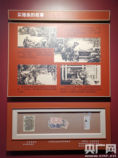 貴州省遵義市中華蘇維埃共和國國家銀行舊址墻上展示的買豬條故事(央廣記者熊逸攝)