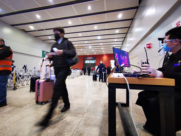 北京南站進出站人員通過門式測溫儀和固定式紅外測溫儀,工作人員實時監(jiān)看設(shè)備(北京鐵路供圖)