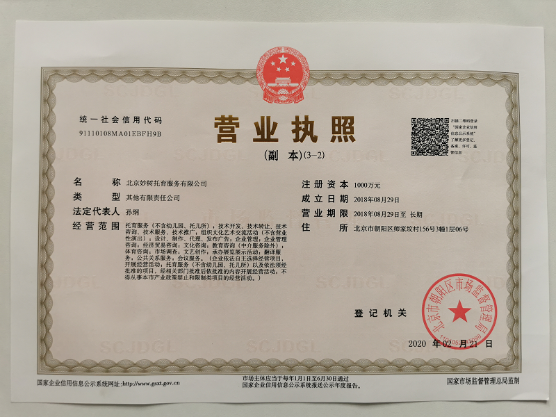北京市第一家托育機構營業(yè)執(zhí)照(央廣網發(fā) 妙樹托育中心供圖)