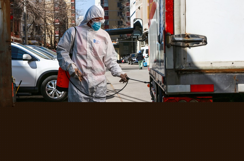 將醫(yī)療廢物裝車后,北京環(huán)衛(wèi)集團固廢物流公司醫(yī)廢中心職工對作業(yè)車輛車身消毒(北京環(huán)衛(wèi)集團供圖)