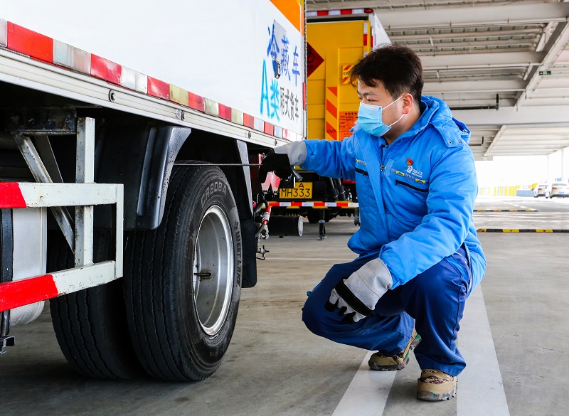發(fā)車前,北京環(huán)衛(wèi)集團固廢物流公司醫(yī)廢中心職工王廣檢查作業(yè)車輛(北京環(huán)衛(wèi)集團供圖)