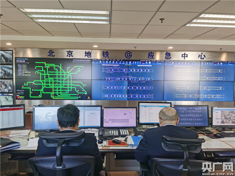 北京地鐵公司工作人員正在應(yīng)急指揮大廳內(nèi)監(jiān)控列車滿載率情況(央廣網(wǎng)記者劉一荻 攝)