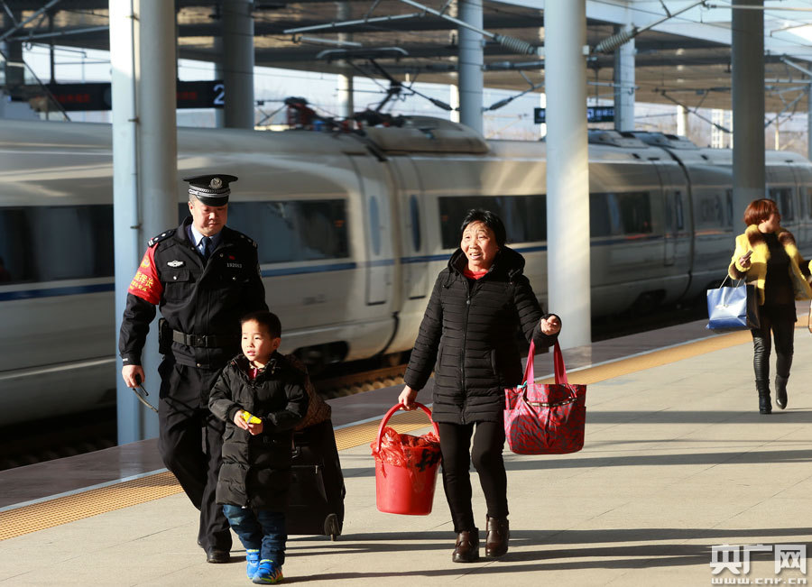 央廣網(wǎng)武漢1月21日消息(記者熊峰 通訊員趙軍 胡金力)1月21日,農(nóng)歷臘月二十四,是南方傳統(tǒng)的“小年”。圖為:1月21日,簡清漢在孝感北站協(xié)助旅客進站上車。 -