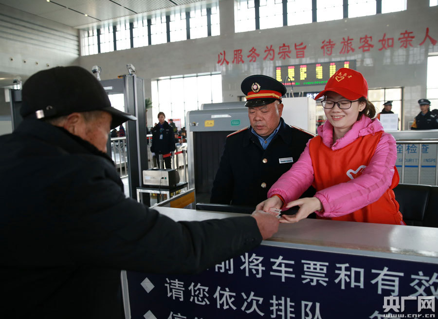 “來來來,大家都別忙了,快過來吃年飯!這些年過年都是你們嫂子做飯吃……”這是武漢鐵路公安局武漢公安處孝感北車站派出所副教導(dǎo)在食堂桌邊傳來的聲音。圖為:1月21日,簡清漢的女兒簡夢悅(右)在車站大廳當(dāng)志愿者,協(xié)助引導(dǎo)旅客驗證進站。 -