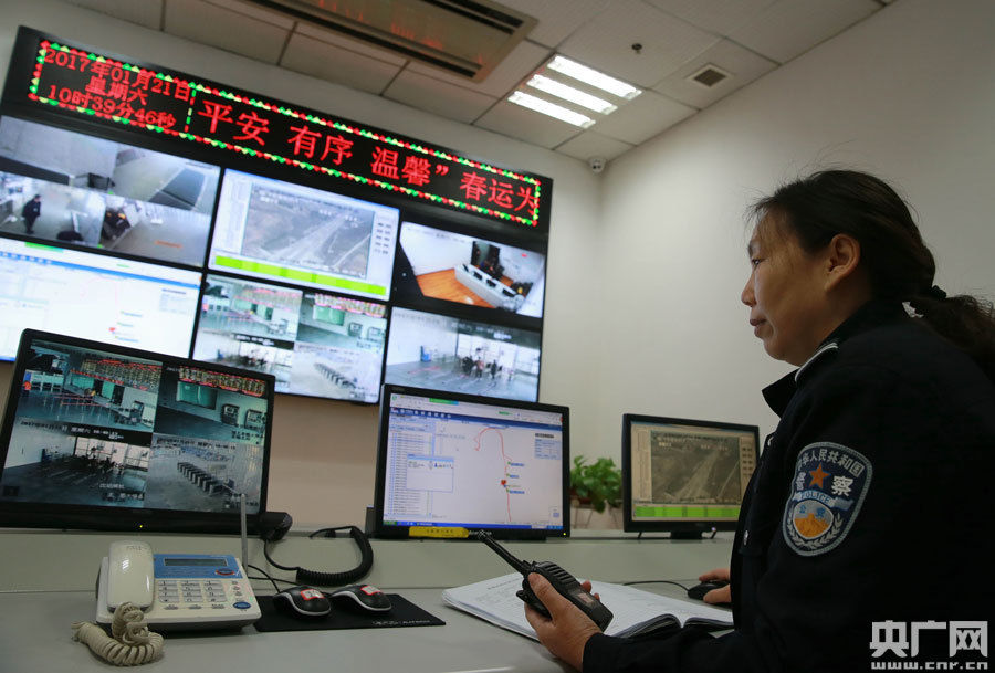 “嫂子”名叫熊麗霞,是簡清漢的妻子。從2014年起,為了照顧丈夫,替丈夫分擔(dān)一份辛勞,熊麗霞來到孝感北站派出所應(yīng)聘輔警,負責(zé)孝感北站派出所實時監(jiān)控系統(tǒng),春運期間幾乎都在監(jiān)控機房盯守。圖為:1月21日,簡清漢的妻子熊麗霞在派出所監(jiān)控室值班。 -