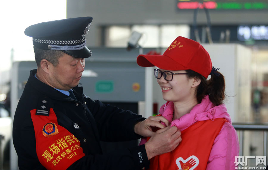 女兒簡夢悅是湖北工業(yè)大學(xué)大四學(xué)生。今年春運,她主動來到爸爸媽媽身邊,當(dāng)上了孝感北站春運義務(wù)志愿者,為乘客服務(wù)。圖為:1月21日,簡清漢(左)和女兒簡夢悅在車站大廳參加春運工作。 -