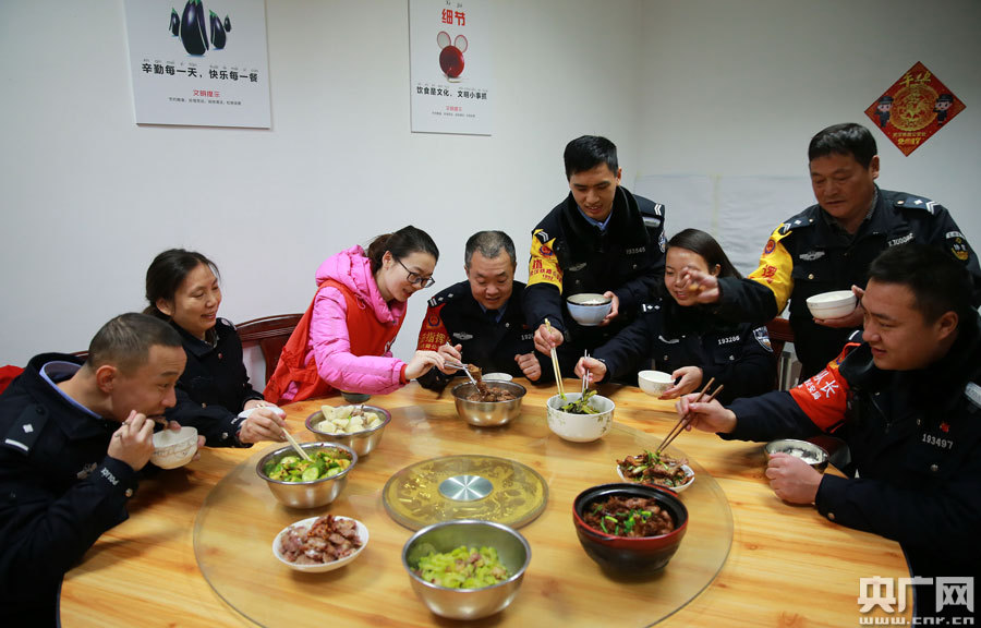 圖為:1月21日是農(nóng)歷小年,一家三口和派出所民警們一起吃了頓團圓飯后,又各自奔忙在崗位上。 -