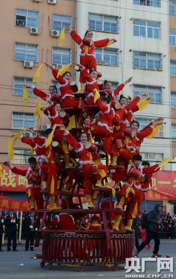 山西稷山:紅火鬧“春”社火表演 央廣網(wǎng)稷山2月14日消息(記者賀威通 通訊員楊明有)高臺花鼓敲起來,高蹺走獸抖起來,歡快秧歌扭起來,廣場舞蹈跳起來,社火鬧新春,稷山嗨起來…… 近日,后稷故里、紅棗之鄉(xiāng)山西稷山縣人頭攢動,熱鬧非凡。2017年“文明之春”大型社火表演活動隆重舉行,為當?shù)睾蛠碜詴x陜豫黃河三角洲許多縣市的百姓獻上了一場豐盛的社火表演,讓群眾體驗到民間文化藝術(shù)的魅力,度過了一個歡樂祥和的新春元宵佳節(jié)。 稷山,是中國農(nóng)耕始祖后稷培植五谷、教民稼穡的地方。在當?shù),像我國北方地區(qū)一樣,正月十五元宵佳節(jié),群眾有元宵鬧社火的傳統(tǒng)習俗。稷山社火表演,以當?shù)匚墨I史料、文化歷史淵源、傳統(tǒng)民間傳說和戲劇故事為題材,通過一個或一組人物展現(xiàn)一個故事,一個故事即為一轉(zhuǎn)社火。 當日,艷陽高照,春寒料峭,稷峰街上氣氛熱烈,到處洋溢著歡聲笑語。上午10點,社火表演在氣勢宏大、整齊劃一的百人旗隊中拉開序幕。稷山縣社火表演,來自當?shù)乜h直機關(guān)單位和稷峰鎮(zhèn)各鄉(xiāng)村的64支社火代表隊選派節(jié)目,參加了元宵社火表演活動。伴隨著歡快的音樂節(jié)奏,演員們精神飽滿,神采飛揚。 舞龍、舞獅、抬閣、秧歌、高臺花鼓、高蹺走獸、馬拉鼓車等,具有濃郁地方特色的表演節(jié)目,盡現(xiàn)觀眾眼前。從站前路出發(fā)至振興路,約2公里長的隊伍,見首不見尾。 據(jù)了解,稷山民間社火,是春節(jié)期間傳統(tǒng)民間的自演自娛活動。它來源于古老的土地與火的崇拜。跑旱船,跑竹馬,編隊穿梭奔馳、跳躍、對唱,樂感強烈,節(jié)奏鮮明,氣氛熱烈。稷山抬閣,縣境內(nèi)汾南汾北精心設(shè)計制作的抬閣,大多是集歷史故事、神話傳奇于一體,融繪畫、戲曲、彩扎、紙塑、雜技等藝術(shù)為一身的特色傳統(tǒng)民俗舞蹈,已經(jīng)有數(shù)千年的歷史。如牛郎織女、武圣關(guān)公、關(guān)公與貂蟬等等。 地處汾水河槽地帶的稷峰鎮(zhèn),這次參加縣里社火表演的抬閣,有的是一個演員伸出手臂,上面站立著另一個演員;有的是荷花高空盛開,一個小孩站在荷花上面左右旋轉(zhuǎn);有的是一個演員兩臂伸開,一手抓著一個小孩的辮子,小孩懸在空中一動不動,高處的演員漫舒廣袖,輕輕擺動身體,下面抬拉的人穩(wěn)步向前。有著悠久歷史淵源的稷王威風鑼鼓,民間鼓樂中是枝奇葩,光彩奪目,是古老的民間藝術(shù)形式。以節(jié)奏強烈明快、場面壯闊粗獷為特點,充分展示了稷王山下汾河兩岸群眾質(zhì)樸豪放的氣質(zhì)。稷王威風鑼鼓,老百姓俗稱 "家伙",是集鑼、鼓、鐃、釵四種樂器合奏表演的一種傳統(tǒng)打擊鼓樂,并融音樂、舞蹈、技藝于一體,是稷山民間鼓樂的突出代表。 稷山花鼓,敲敲打打、扭扭唱唱。著男式表演服裝的演員為核心人物,在舞臺或村組中心地帶抱鼓表演,另有四個或八個著女裝的花鼓女圍著他表演,扭秧歌;ü臉逢犜谂赃叞樽,而且每一個段落間還配有花鼓曲演唱,F(xiàn)在,抱鼓的由單人變?yōu)殡p人雙打,扭秧歌的花鼓人女由四人增至八人、十人。稷山花鼓在境域內(nèi)汾南、汾北各有不同,其中以汾南東蒲的花鼓和汾北桐上的花鼓最為著名。