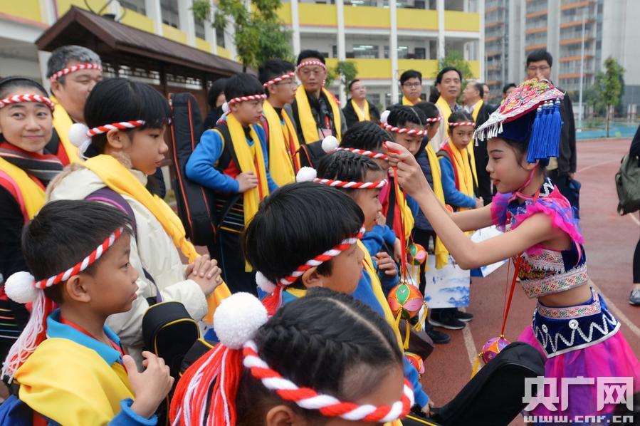 北濱小學學生彈唱少數(shù)民族歌曲 央廣網(wǎng)南寧3月29日消息(記者張壘 許大為)近來,臺灣當局玩命大搞“去孔子”化?膳c此同時,島內(nèi)的花蓮縣北濱小學師生卻到訪廣西南寧,借交流之機祭念孔子,尋文化之根。 北濱小學20多名師生是來參加“2017年中華一家親——桂臺各民族歡度‘壯族三月三’”活動的。3月28日,他們來到南寧碧翠園學校,和全校師生交流。 “呦呦鹿鳴,食野之蒿。我有嘉賓,德音孔昭。視民不恌,君子是則是效。我有旨酒,嘉賓式燕以敖……”. 下午兩點半,碧翠園學校的同學們在校門口排成一行,吟唱著《詩經(jīng)?小雅》中的篇目——《鹿鳴》,歡迎北濱小學師生。 剛進校門,一尊孔子像便出現(xiàn)在眼前。兩岸小朋友停住腳步,抬頭仰望。“向孔老夫子行三鞠躬禮。一鞠躬……”大家跟著祭典主持人,拱手作揖,彎腰行禮。 2014年起,碧翠園學校將國學經(jīng)典和書法融入教學,同時開辟了民族舞蹈等課程。北濱小學雖然只有111名學生,但個個都會吹拉彈唱。在現(xiàn)場,小朋友們以歌舞會友。 碧翠園學校校長蒙誼強說:“科學與人文是孩子成長的雙翼。古圣先賢留下了優(yōu)秀的傳統(tǒng)文化,讓孩子學習傳統(tǒng)文化就如同給他們插上另一只翅膀,讓他們飛得更高、更好! 北濱小學校長周春玉沒想到,大家分隔兩岸數(shù)十年,可治學理念并未產(chǎn)生太大差異,依然秉承著孔子思想!耙话愕暮⒆由砩弦灿辛咙c,教育工作者要挖掘。把學生全當人才看,我們都承襲了孔子因材施教的理念”,周春玉說。